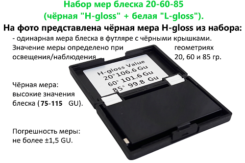 Диапазон единиц блеска (GU) при геометрии освещения (0) /наблюдения(0): · Мера блеска чёрная 60 "H-gloss" · Мера блеска белая 60 "M-gloss" · Мера блеска белая 60 "L-gloss" · Мера блеска двойная 60 (чёрная "H-gloss" + белая "М-gloss") · Набор мер блеска 20-60-85 (чёрная "H-gloss" + белая "L-gloss") |