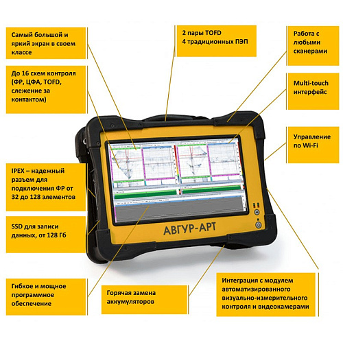 Многоканальный ультразвуковой дефектоскоп АВГУР-АРТ с ручным управлением, оснащенный технологией фазовых решеток, цифровой фокусировкой антенны и методом TOFD.